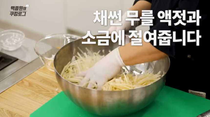 (손을 다치지 않기 위해 목장갑 사용을 추천합니다.) - 무채에 꽃소금, 멸치액젓, 새우젓을 넣고 절여줍니다.