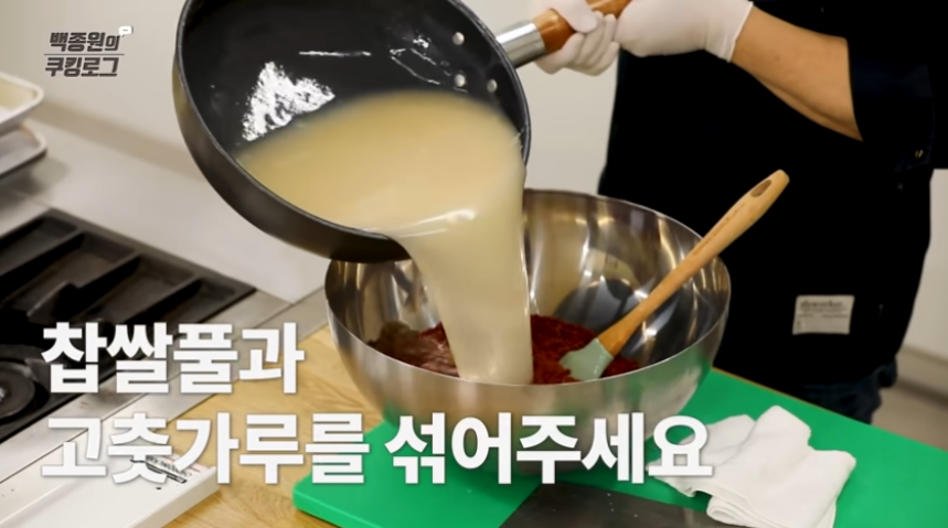 (넣지 않아도 상관없고 소고기 다시다 대신 사골국물 활용해도 됩니다.) - 찹쌀풀 농도가 적당해지면 고춧가루와 미원을 넣고 섞어서 불려줍니다.