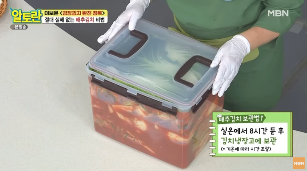 골마지를 방지하기 위해 절인 배추 겉잎을 배추김치가 보이지 않도록 덮어줍니다. - 실온에서 8시간 보관 후 김치냉장고에 보관해줍니다.
