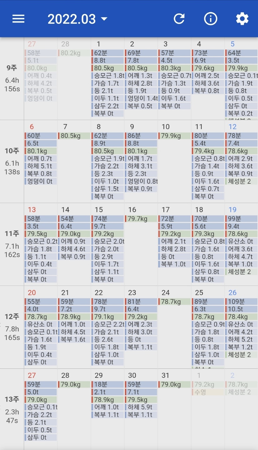 4월 이후로는 새벽 수영을 시작하면서 웨이트 트레이닝 운동 횟수가 현저히 줄었습니다.