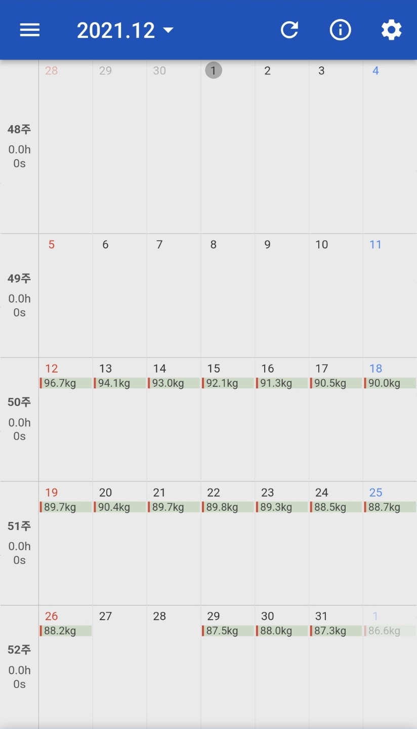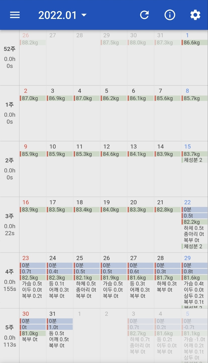 운동과 식단은 꾸준히 하였지만, 12월 마지막 주와 1월 중순의 체중 변화가 크지 않은 것을 확인할 수 있습니다.