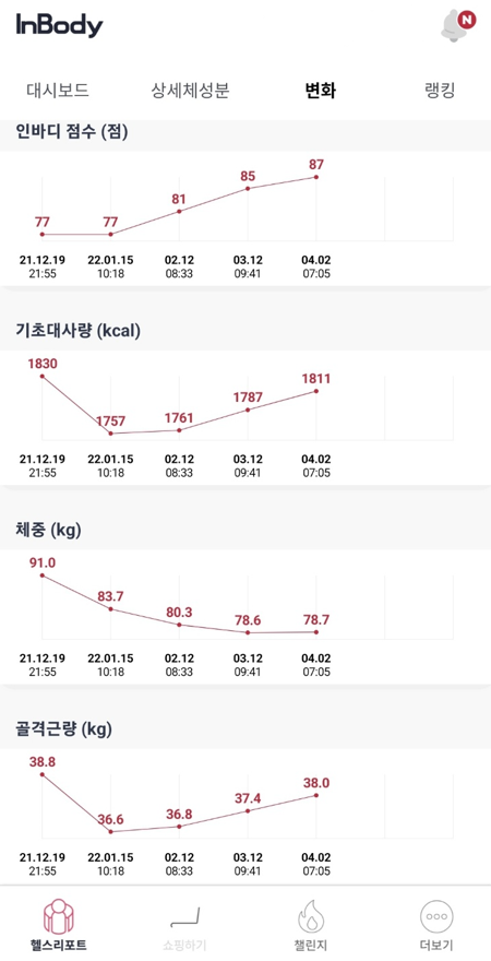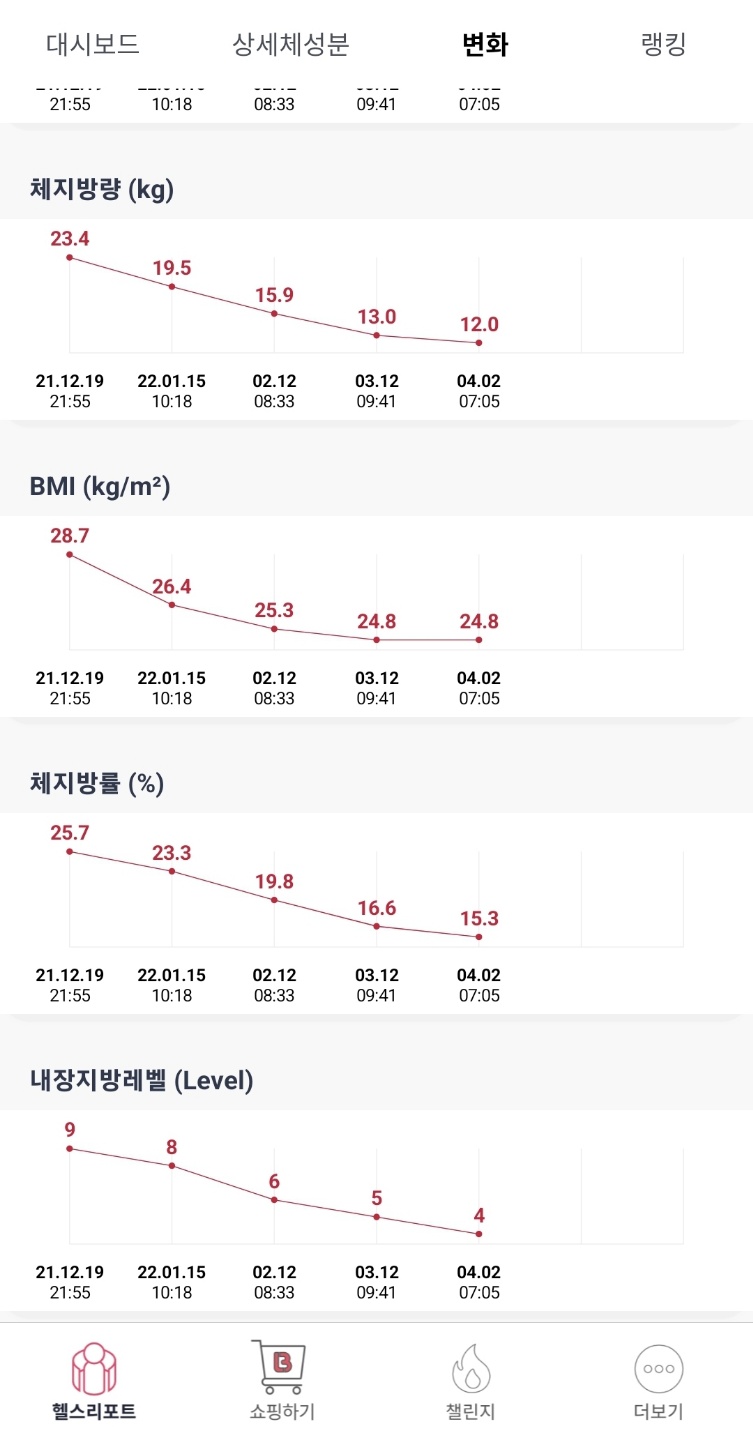 다이어트를 시작한 이후 코스트코에서 가정용 인바디를 구매하여 기록을 시작했고 주 1회 측정하였습니다.