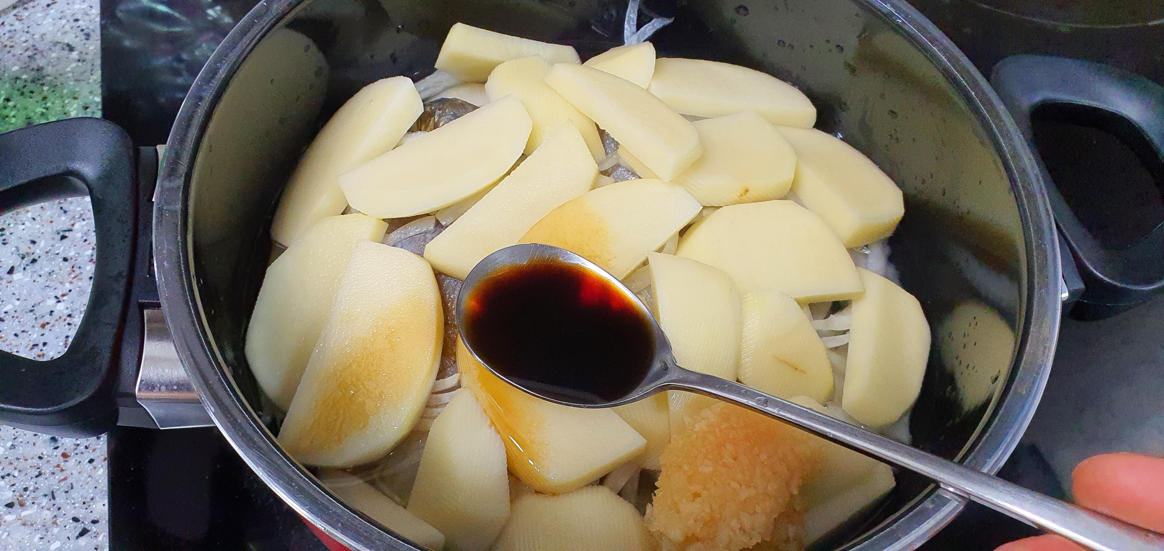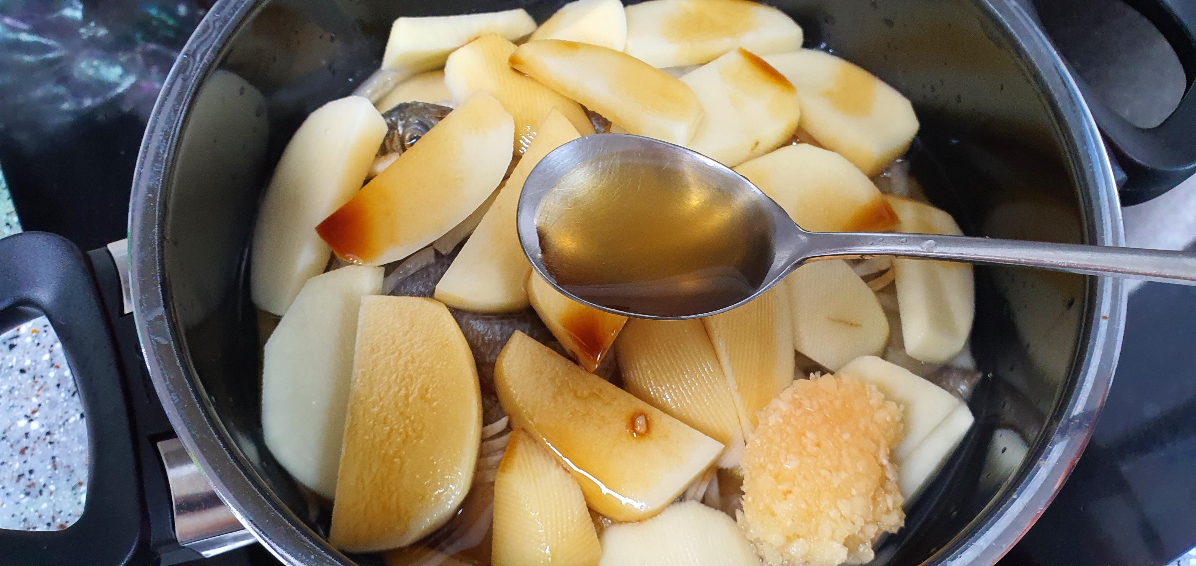 조림에서 중요한 것 중 하나가 바로 적절한 물의 양입니다. 포스팅 작성을 위해 계량해보니 저는 약 300ml 정도 넣었습니다. 하지만 집집마다 넣는 굴비의 양, 무와 감자의 양이 다르기 때문에 저와 물 양을 똑같이 넣으시면 안 됩니다. 무 위에 깔린 굴비의 몸이 절반 정도 잠길 정도만 물을 넣어주세요.