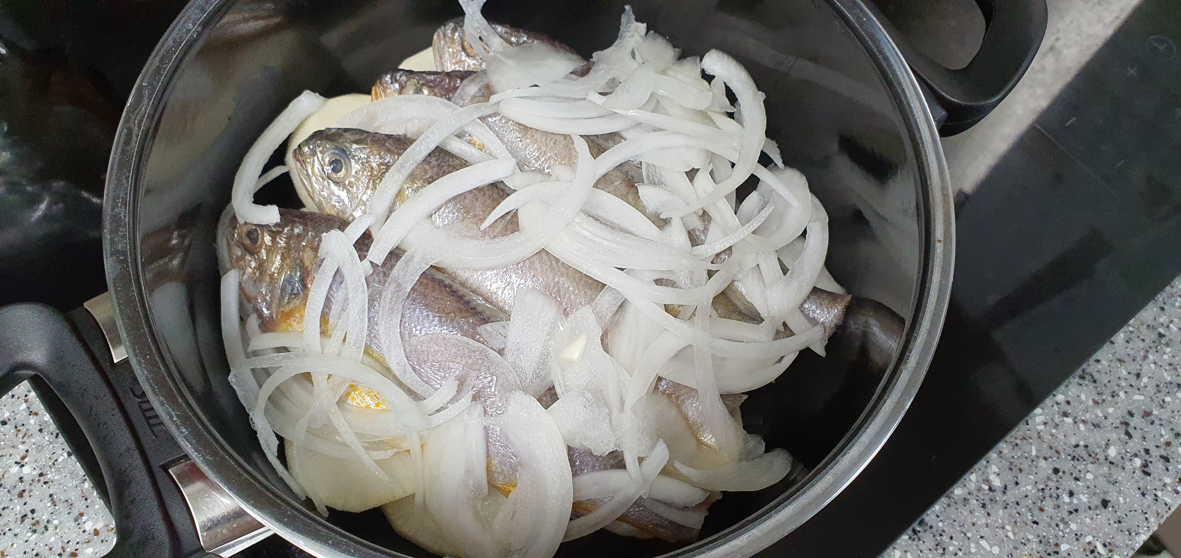 양파는 얇게 썰어 굴비 위에 얹어 주었습니다. 저는 양파 반개를 사용했지만 집집마다 사용하는 양파의 크기가 다르기 때문에 적당히 굴비를 덮어줄 만큼 준비하시면 됩니다. 얇게 썰어 통으로 넣으셔도 되지만 깍둑썰기만은 하지 마세요. 맛은 같아도 모양이 엄청 이상할 거예요.
