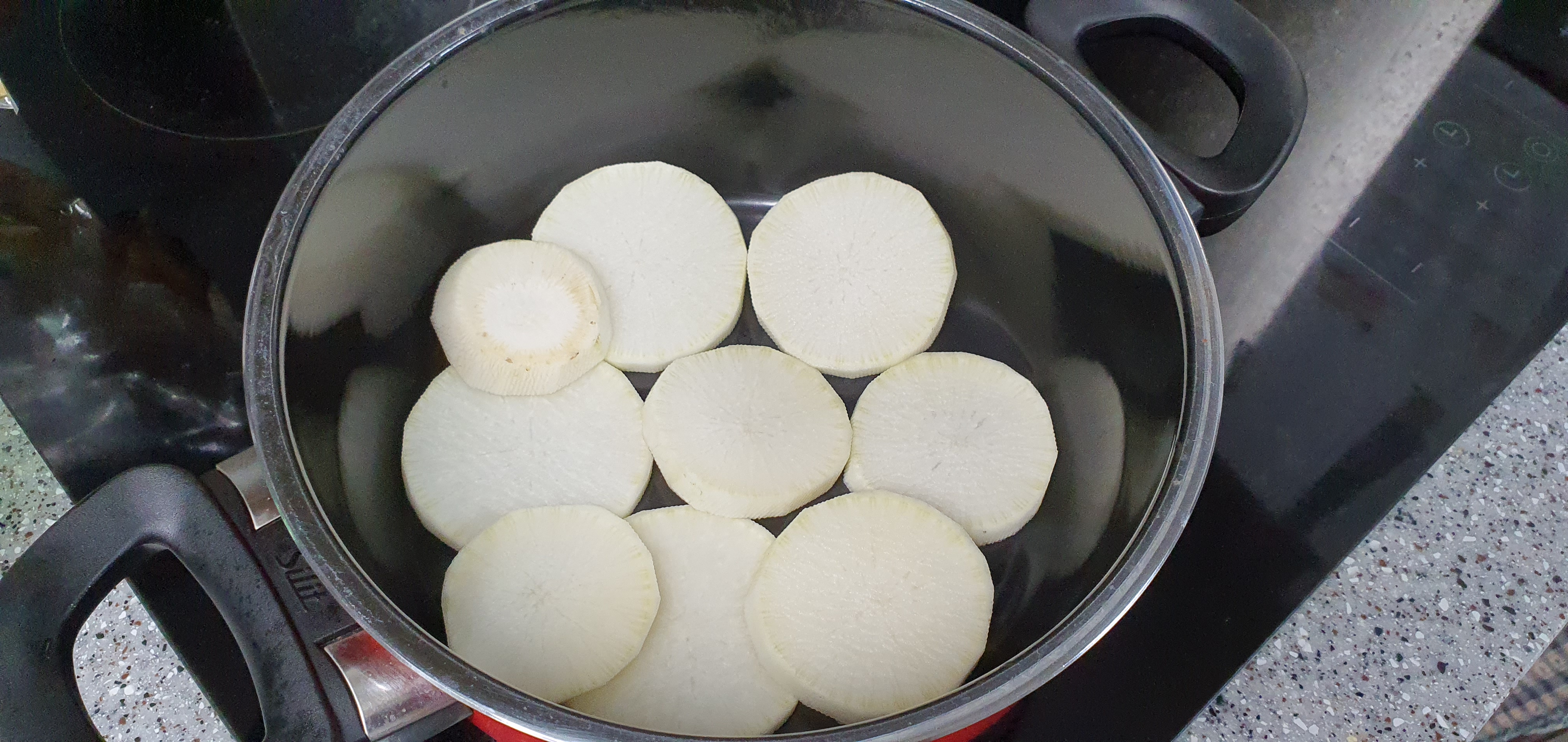 무는 물로 깨끗하게 씻은 뒤 1~2cm 정도 두께감 있게 썰어줍니다. 냄비 바닥을 충분히 덮을 정도로 준비해주시면 됩니다. 가장 아래 깔아 놓은 무가 나중에 뜨거운 열로부터 굴비를 지켜주는 역할을 하며, 조림의 시원하고 깊은 맛을 내는 역할을 해줍니다.