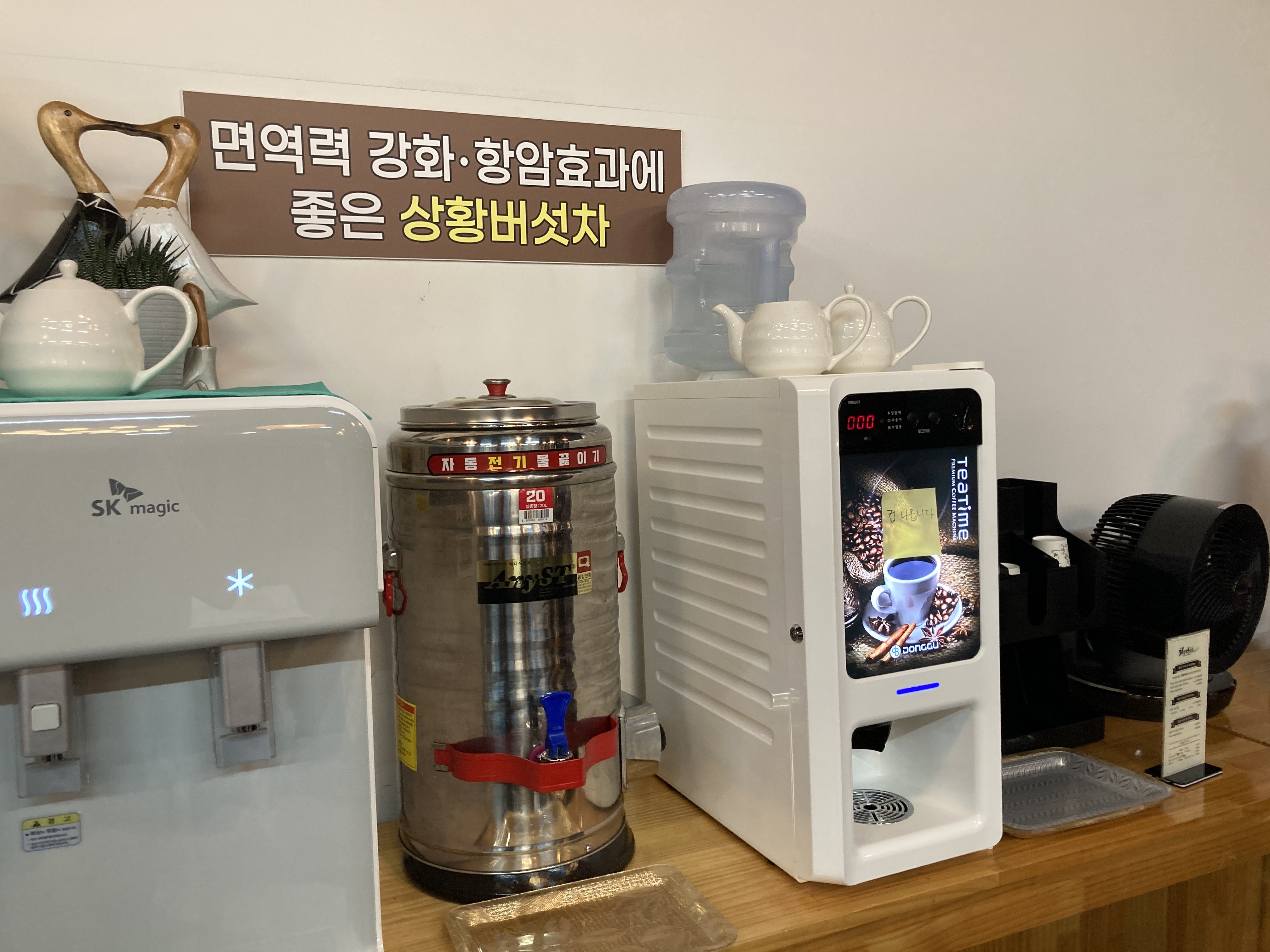 상황버섯차와 커피 자판기, 정수기가 있어 식사 후 즐기기 좋습니다.