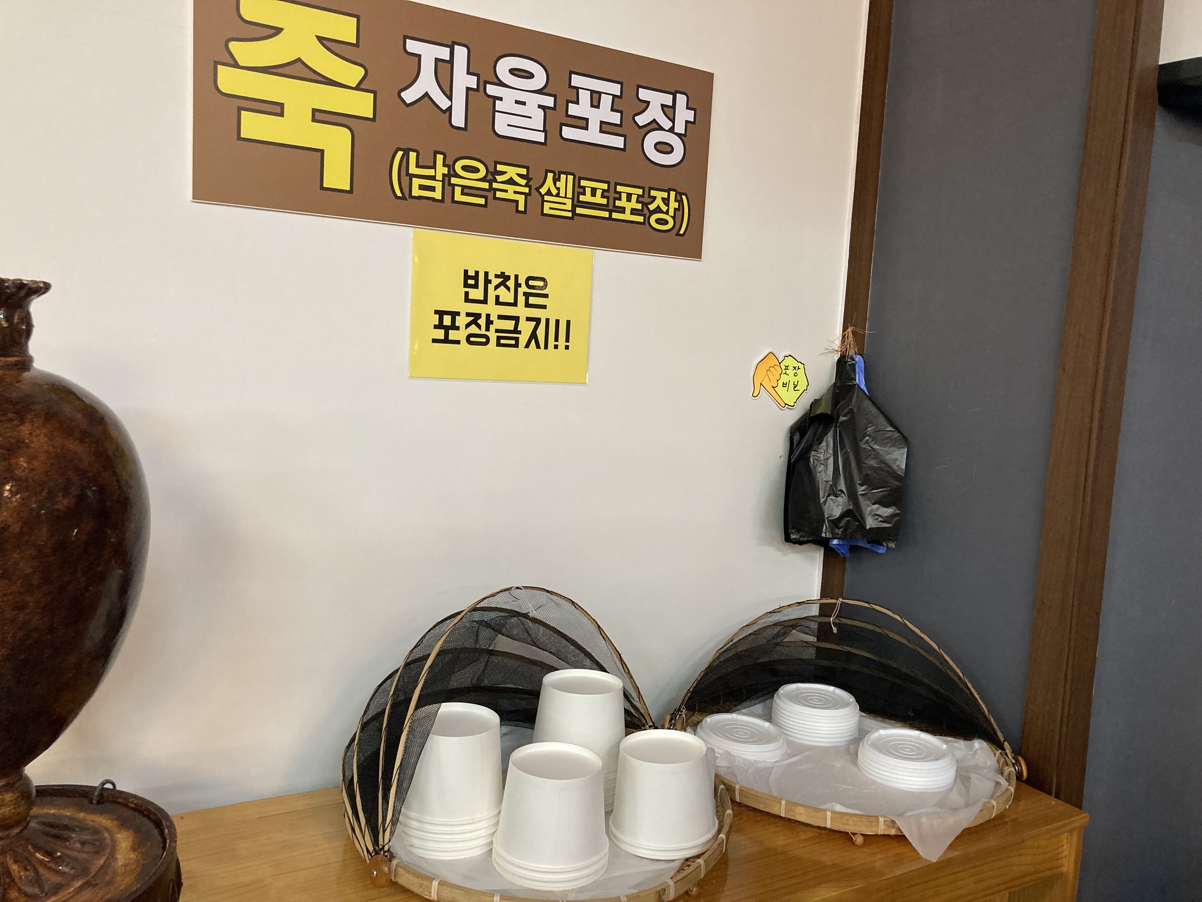 죽이 남을 경우 포장해갈 수 있는 포장대가 마련되어 있습니다. 누룽지 죽의 맛이 매우 좋아 포장하는 사람은 거의 없을 것 같습니다.
