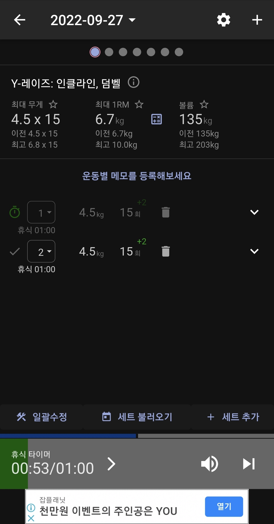 위의 리스트에서 한 가지 운동(와이 레이즈)을 선택하면 해당 운동에 대한 세부 정보가 나옵니다. 여기서 운동 무게, 횟수, RIR, 휴식 시간, 세트 수 등 다양한 정보를 운동 전에 계획할 수 있습니다.