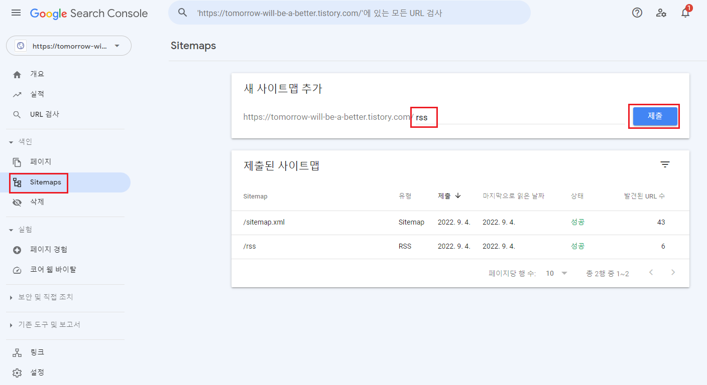 왼쪽 메뉴바에서 'sitemap' 클릭